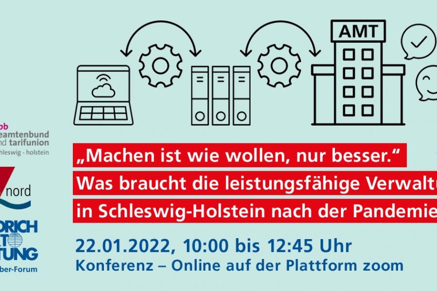 Die Konferenz von DGB Nord, dem Landesverband Schleswig-Holstein des Deutschen Beamten-bundes und der Friedrich-Ebert-Stiftung diskutiert Vorschläge für eine leistungsfähige Verwaltung im nördlichsten Bundesland. Dabei werden die Landes- und die kommunale Ebene gleichermaßen in den Blick genommen. In beiden Panels besteht Gelegenheit für alle Teilnehmenden, eigene Er-fahrungen und Vorschläge in die Diskussion einzubringen. Wir laden Sie herzlich zu dieser Konferenz ein!